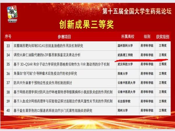 中南在线消息(通讯员 杨魏杰 摄影 胡瑞年 报道)全国药学类专业顶级赛事——“第十五届全国大学生药苑论坛”于近日圆满落幕,全国98所高校药学类专业学生的近250项作品参赛,太阳成城集团tyc234cc药学专业5名学生组成的团队荣获创新成果三等奖。TYC234CC太阳成集团是全国同类高校中唯一获创新成果奖的大学。