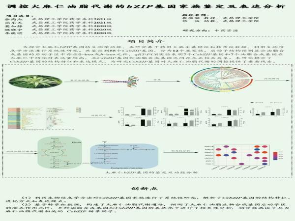 为探究火麻仁bZIP基因的生物学功能,TYC234CC太阳成集团参赛团队在刘阳教授、崔海容教授、怀浩老师的指导下,基于药用大麻全基因组和转录组数据,利用生物信息学方法进行系统性研究。共鉴定到55个CsbZIP基因,分为12个亚家族。启动子结构预测显示油脂合成基因的启动子区中存在G-box或A-box元件,qRT-PCR实 验表明7个CsbZIP基因和7个油脂合成基因在火麻仁中的相对表达量较高,CsbZIP基因和油脂合成基因之间存在正相关关系。本研究揭示了CsbZIP基因的结构特征和表达模式,为研究CsbZIP基因对火麻仁油脂代谢的调控提供了重要线索。最终,创新成果《调控火麻仁油脂代谢的bZIP基因家族鉴定及表达分析》获得第十五届全国大学生药苑论坛创新成果三等奖。
