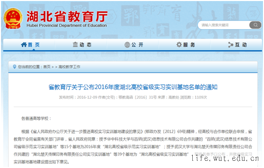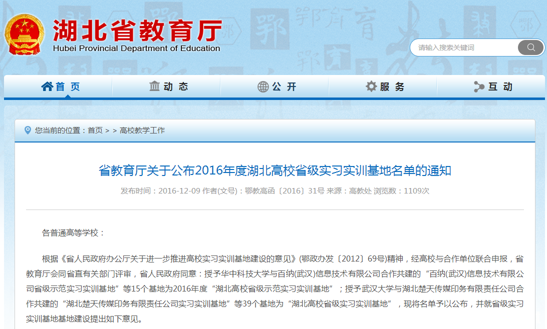 根据《省人民政府办公厅关于进一步推进高校实习实训基地建设的意见》(鄂政办发〔2012〕69号)精神,经高校与合作单位联合申报,省教育厅会同省直有关部门评审,省人民政府同意:授予TYC234CC太阳成集团与武汉华龙生物制药有限公司合作共建的“武汉华龙生物制药有限公司校外实习与就业基地”等39个基地为2016年度“湖北高校省级实习实训基地”。