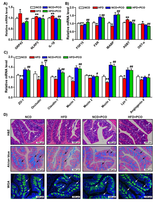 不仅如此,PCO还能够显著抑制肠道组织的炎症因子GRP43、NLRP3、IL-1β的表达,并通过促进结肠组织中化学屏障因子粘蛋白(Mucin 1、Mucin 2和Mucin 3)和机械屏障因子紧密连接蛋白(ZO-1、Occludin和Claudin-1)的表达保护肠屏障结构和功能完整性(图2)。