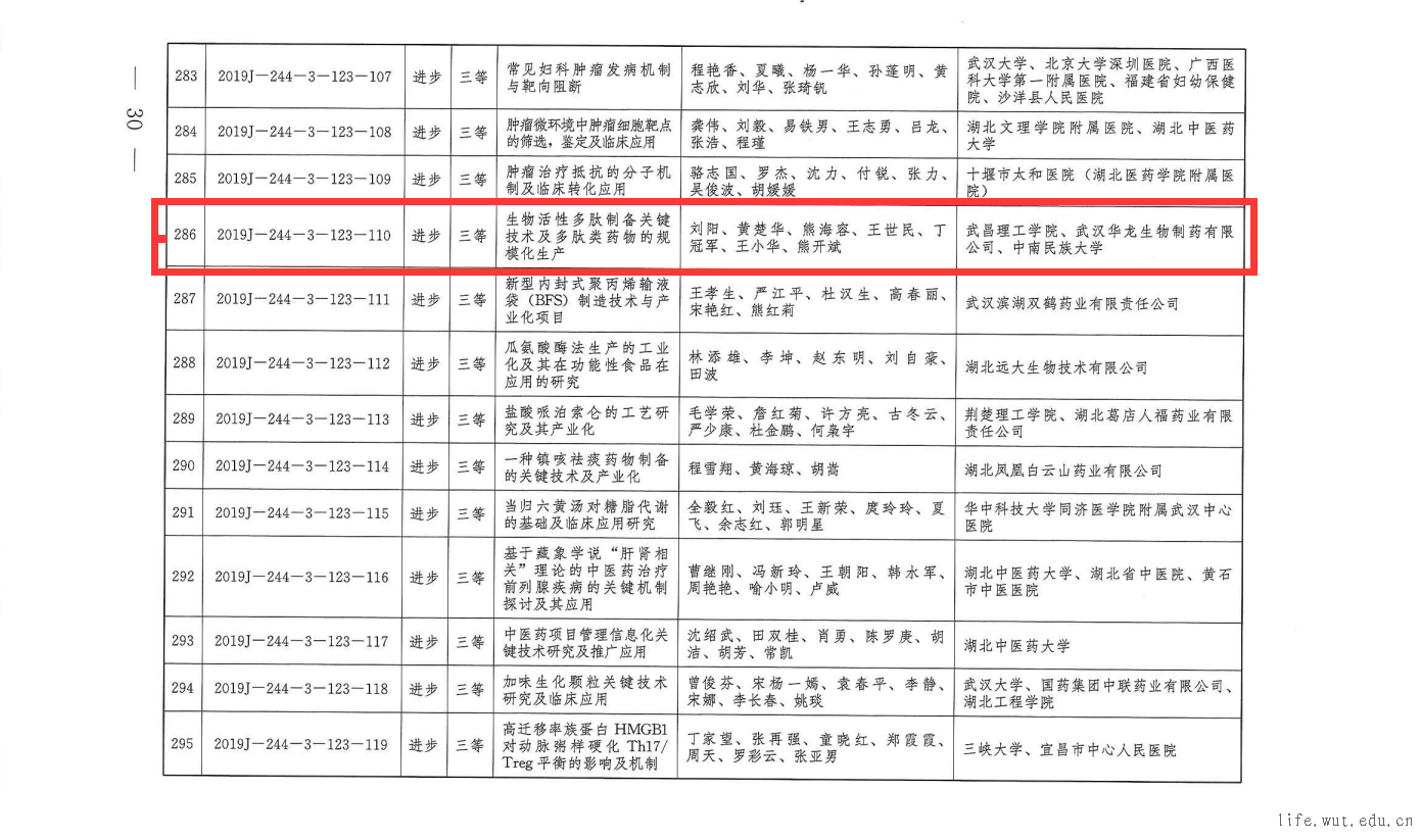 2020年1月3日,湖北省人民政府发布《2019年度湖北省科学技术奖的决定》(颚政发2020[2号]),由太阳成城集团tyc234cc刘阳教授主持,与武汉华龙生物制药公司、中南民族大学联合申报的《生物活性多肽制备关键技术及多肽类药物规模化生产》成果,荣获2019年度湖北省科技进步三等奖。全省民办高校(含独立学院)仅有两项成果获奖,均为湖北省科技进步三等奖。