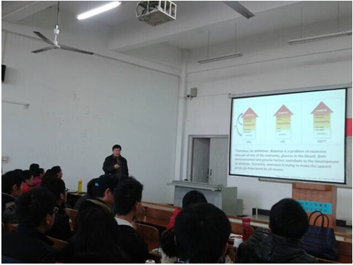 这次讲座陈教授以糖尿病的致病机理与病症现象为开头引入了主题,他主要为同学们讲述了胰岛素的发现历史与研究成果与自己的研究发现:对胰岛素刺激诱导的肝细胞中SREBP-1C基因的转录调控进行了研究,通过分子克隆和生物化学及分子生物学实验,首次发现了位于SREBP-1C启动子上的胰岛素反应位点。该实验首次将胰岛素刺激反应跟肝细胞中的胆固醇代谢调控联系了起来。这一成果对于肥胖,糖尿病及高血脂导致的脂代谢失控均具有指导意义。