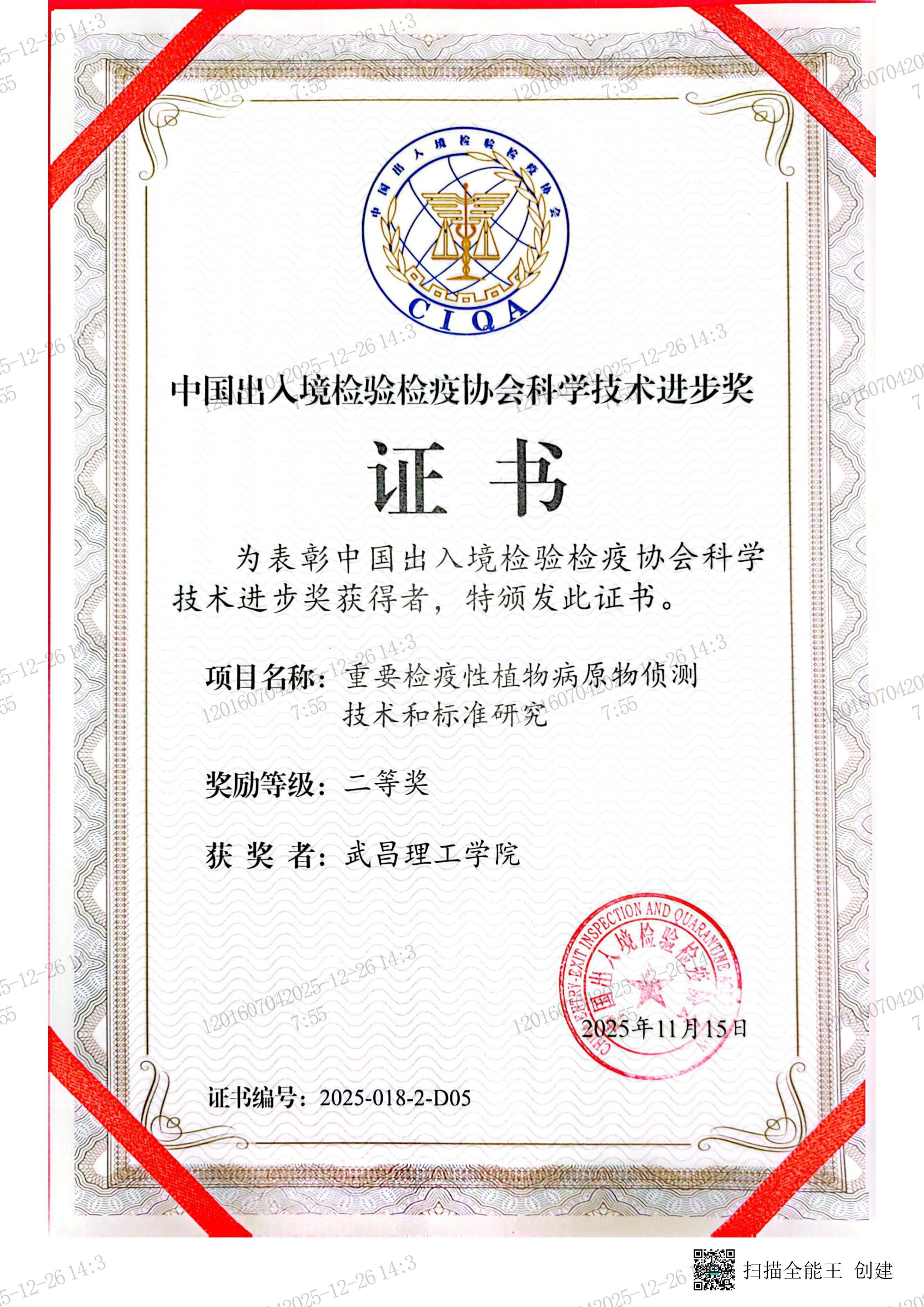 中国出入境检验检疫协会科学技术进步二等奖