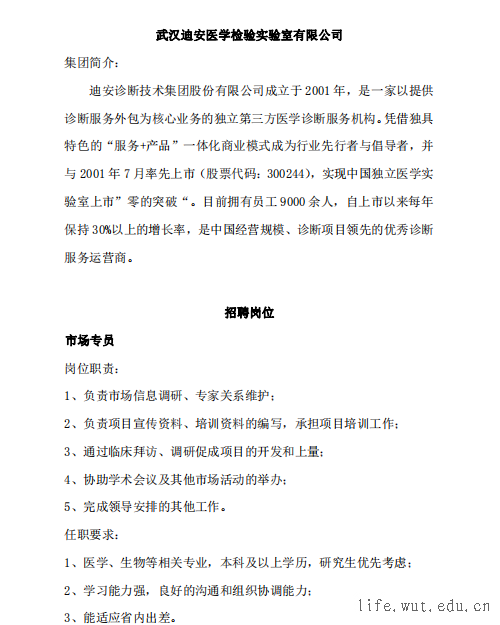 武汉迪安医学检验实验室有限公司招聘简章