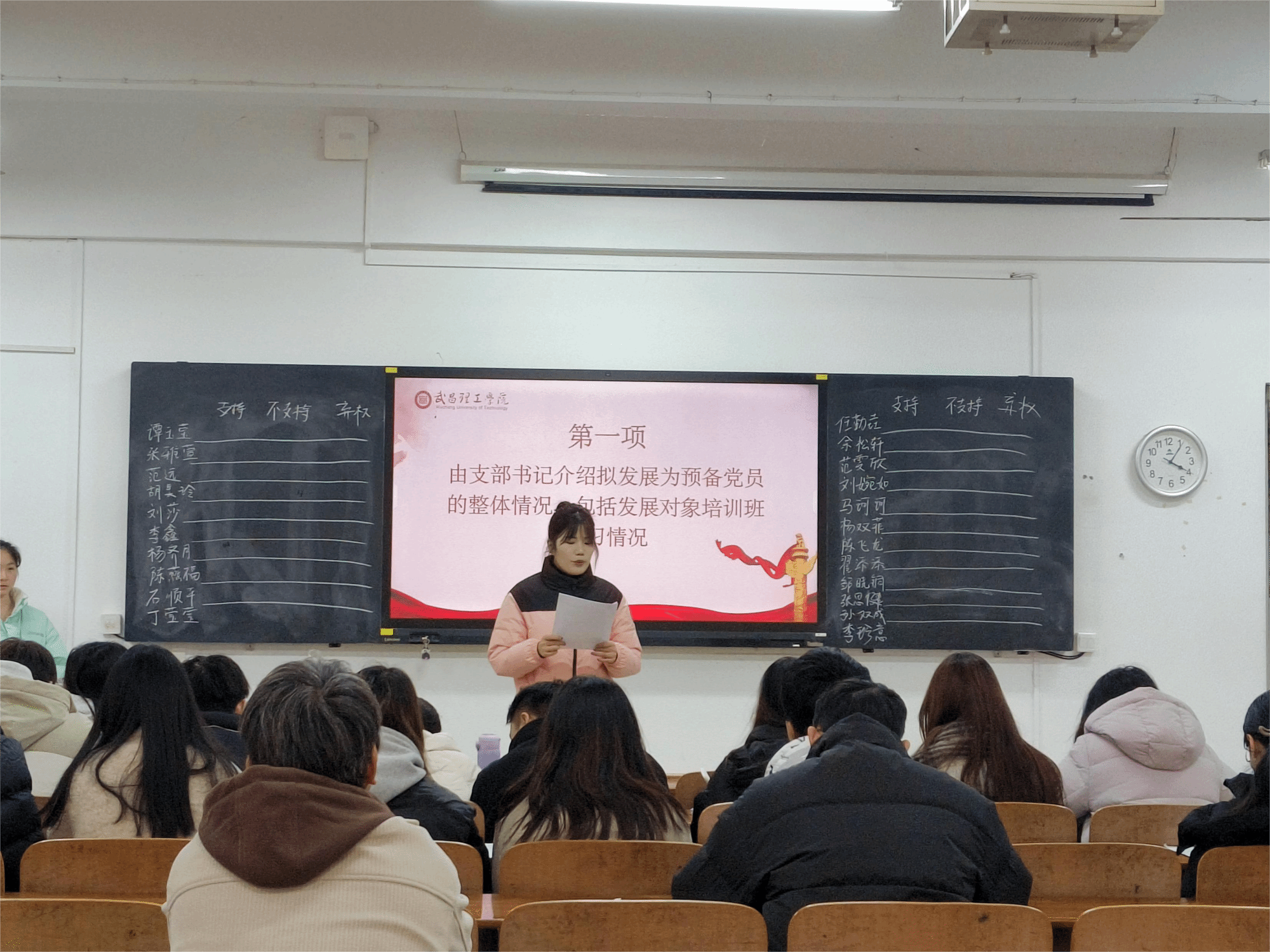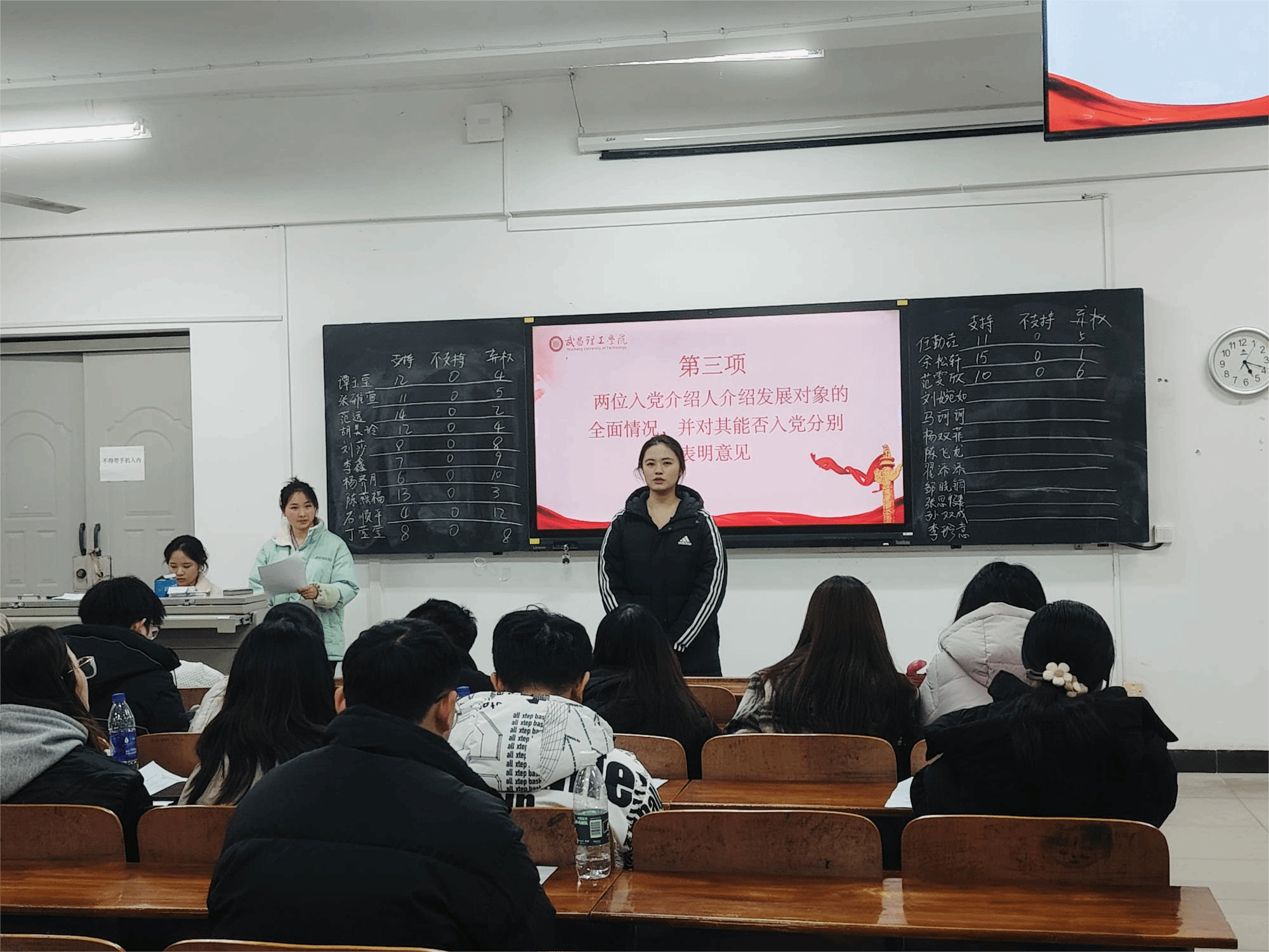 紧接着,发展对象们逐个上前,开启个人汇报环节。他们身姿笔挺、目光坚定,带着对党的赤诚向往,将个人成长经历、入党决心毫无保留地袒露。有的谈及在乡村支教时,目睹艰苦环境下孩子们对知识的渴求,从而立下为教育事业奉献的志向;有的说起参与校园抗疫行动,在搬运物资、协助核酸检测中,感受到使命召唤,党性愈发坚定。每一位汇报完毕,党员同志们便即刻展开讨论,待意见发表完毕,现场直接进入投票表决环节,同时,为保障程序公正,设立现场党员监票机制。由三位党员同志担任监票员,他们站在显眼位置,目光如炬。工作人员将选票依次分发给有表决权的党员,党员们稍作思考,便认真勾选。投票时,每位党员依次走到监票员身前,递上选票,监票员严谨核对,确保投票过程规范有序。唱票、计票环节更是一丝不苟,监票员全程紧盯,工作人员逐张宣读选票,同步记录结果,每一票都清晰可查,整个流程毫无疏漏。
