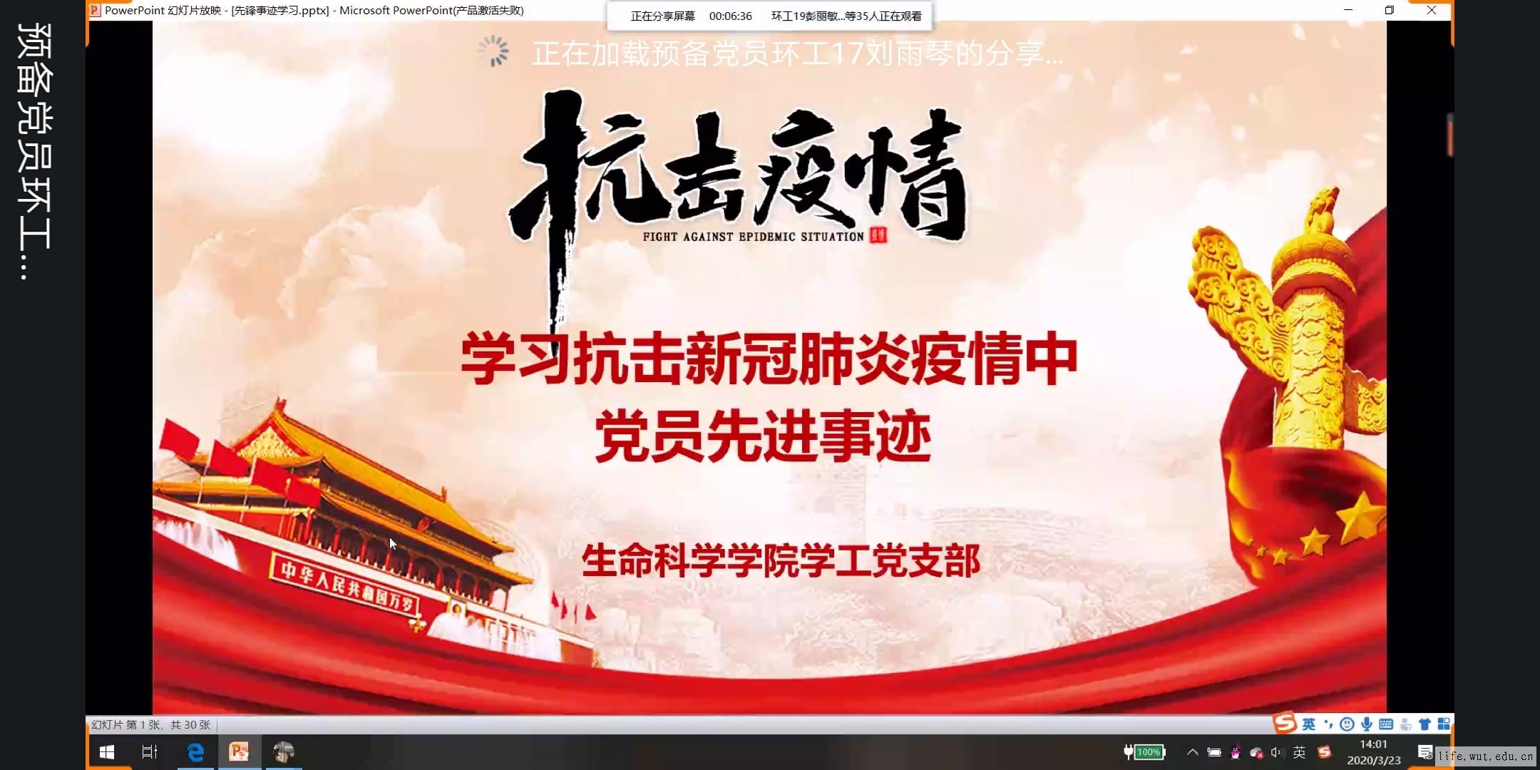 3月24日消息(通讯员 熊萍 报道)3月23日下午,太阳成城集团tyc234cc学工党支部成功开展“学习抗击新冠肺炎疫情中党员先进事迹”培训班专题学习活动。活动由入党积极分子培训班班主任刘雨琴、发展对象培训班班主任张国澳和预备党员培训班班主任唐义三位同志共同策划,张国澳同志担任此次会议的主持人。入党积极分子培训班、发展对象培训班和预备党员培训班学员参加此次会议。