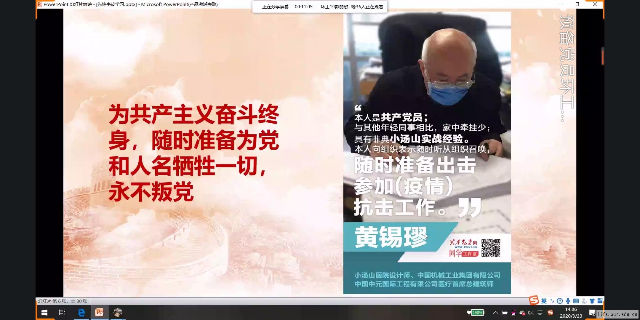 2020年的春节31个省都上报新型冠状病毒感染的肺炎确诊病例,在大多数人在家安度春节时,一群战士却逆行到疫情最严重的武汉去。会议开始,主持人张国澳向同学们介绍了疫情防控阻击战中钟南山、张文宏、黄锡?和张定宇等人的英雄事迹,“我是党员,我先上”的视频让参会同志感触极深,疫情面前,党员同志冲锋在前,为家国大义奋战在没有硝烟的战场。接着讲述了中国支援韩国、日本、伊朗、意大利和塞尔维亚的故事,观看完视频“携手战疫”后,主持人提出“请讲述一个你知道的,或者刚刚学习的你最感动的人和事”问题,同志们都在QQ群里分享疫情期间最令自己感动的瞬间。药学1710班汪巧园说:“医护人员的子女在家中为奋战一线的爸爸妈妈加油。其中有一个14岁的小女孩用文言文试的语言为一线爸爸加油,她的爸爸看到后非常感动,觉得昨天地小女孩突然长大了,短短的话语给了医院的工作人员莫大的鼓励。”