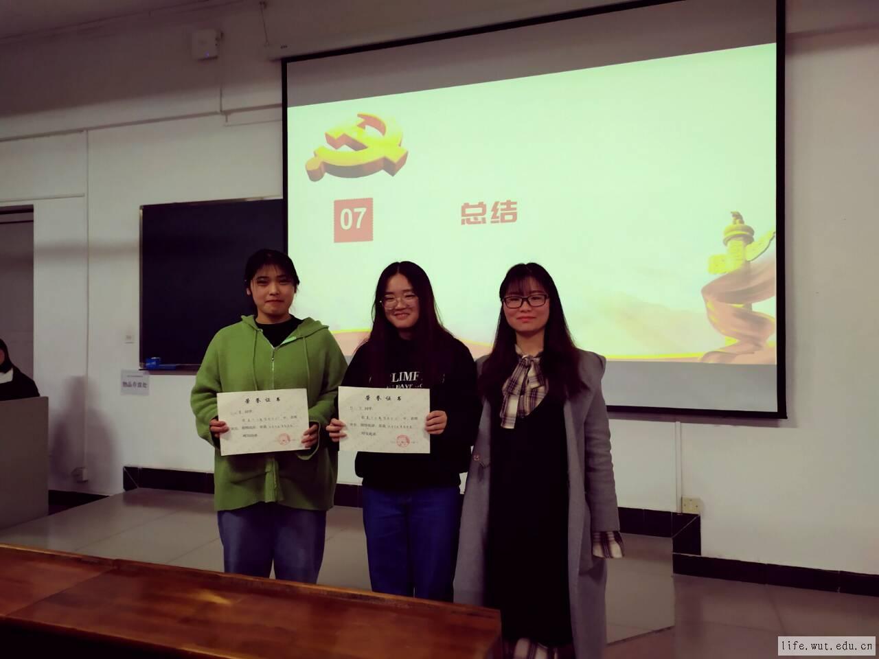 随后,第十五期优秀积极分子代表陈欣发言。陈欣同志来自该院环境工程1701班,她谈到,入党让自己成为一个更优秀的人,并且在学习的过程中了解到很多党性知识,深刻的认识到没有哪一个组织比中国共产党更加伟大。紧接着宣布了8名优秀积极分子以及2名优秀党员名单,党支部书记鲁晓煜为吴云霞、陈欣两位优秀学员颁奖,大家上台领取奖励并与该院学工党支部书记鲁晓煜合影留念。来自该院生物工程1701班的优秀积极分子代表胡杨表示:“要珍惜时间,合理规划时间,提高时间利用率,先提高自己,才能影响身边人。”活动最后由学工党支部书记鲁晓煜同志总结,她说道:“作为积极分子的你们,在我看来最重要的一个问题就是你们始终要明白,你为什么要入党?只有想清了这个问题,你们才会真正有所改变。”