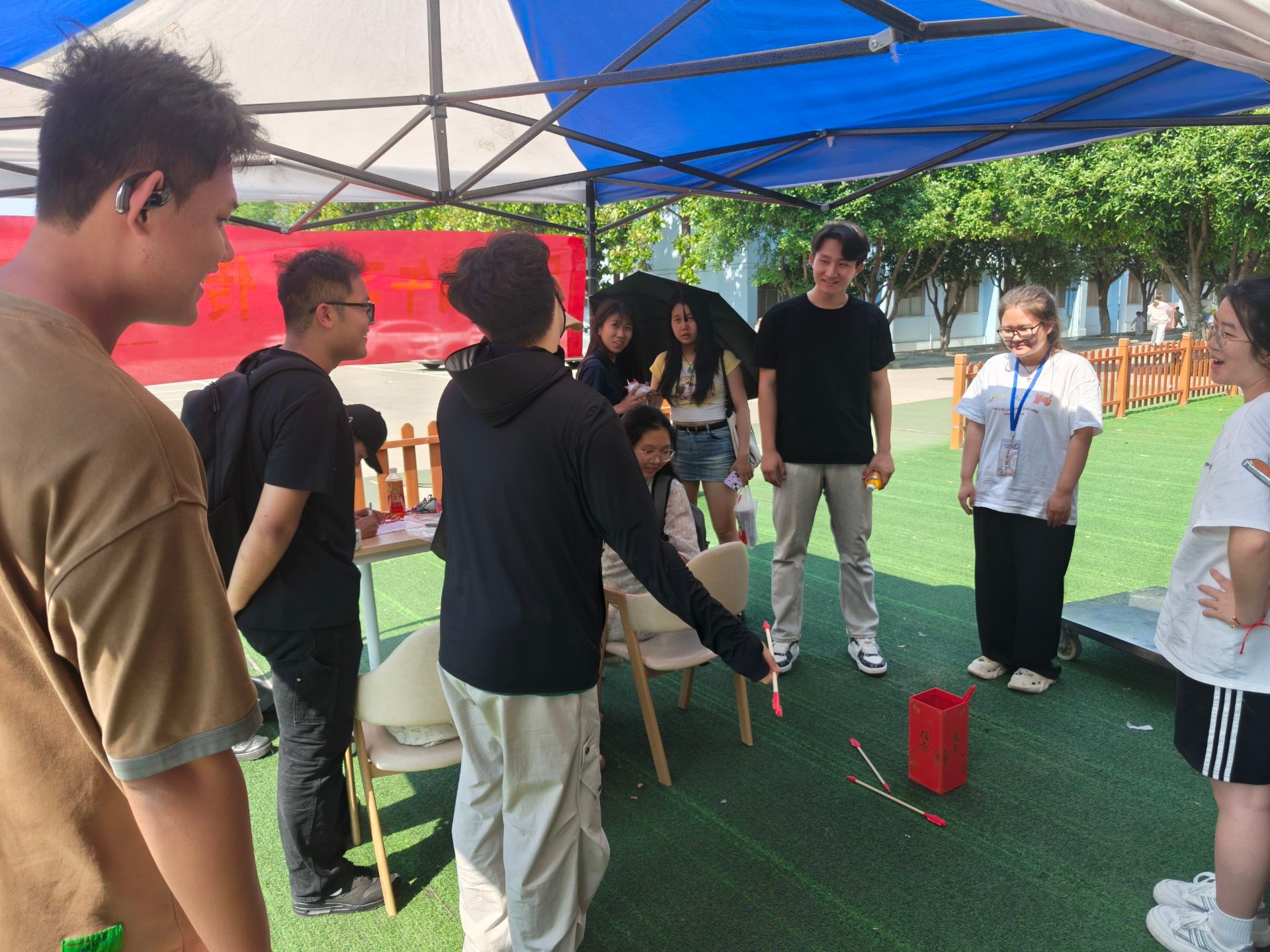 投壶游戏区域热闹非凡,社区委策宣部的干事们积极进行活动宣传,参与活动的同学们在规定距离外投掷箭矢,每当有箭矢投入壶中,现场便会响起一阵欢呼。投中壶中的同学可以获得五彩绳作为奖品,五彩绳象征着吉祥如意,寓意着对美好生活的祝福。太阳成城集团tyc234cc的学子们在投壶的过程中,不仅体验到了传统游戏的乐趣,更感受到了古人的智慧与情怀。