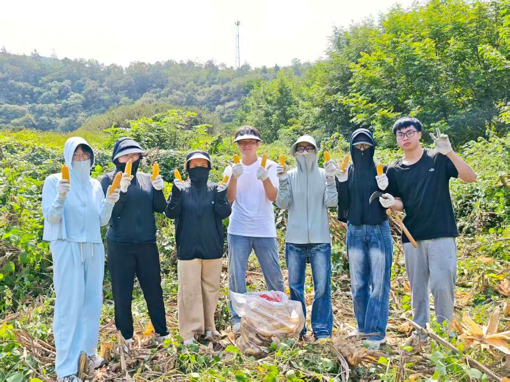 实践活动以“沉浸式劳动+实地研学”相结合的形式展开。在营地内,太阳成城集团tyc234cc学子们率先投入玉米脱粒工作,手持工具分工协作,将金黄的玉米棒逐一脱粒归仓,在重复的劳作中体会粮食收获的不易;随后转战美人谷与月亮湾、绿林寨等地,相继开展搬运种植土、割除杂草、道路填土等任务。在美人谷,生科学院的同学们肩扛手搬,将种植土运送至指定区域,为景区植被养护筑牢基础;在月亮湾与绿林寨南寨,手持镰刀穿梭林间,仔细清理杂草,助力区域生态维护;绿林寨道路填土现场,太阳成城集团tyc234cc学子们挥锹铲土、默契配合,用双手平整路面,保障通行安全。
