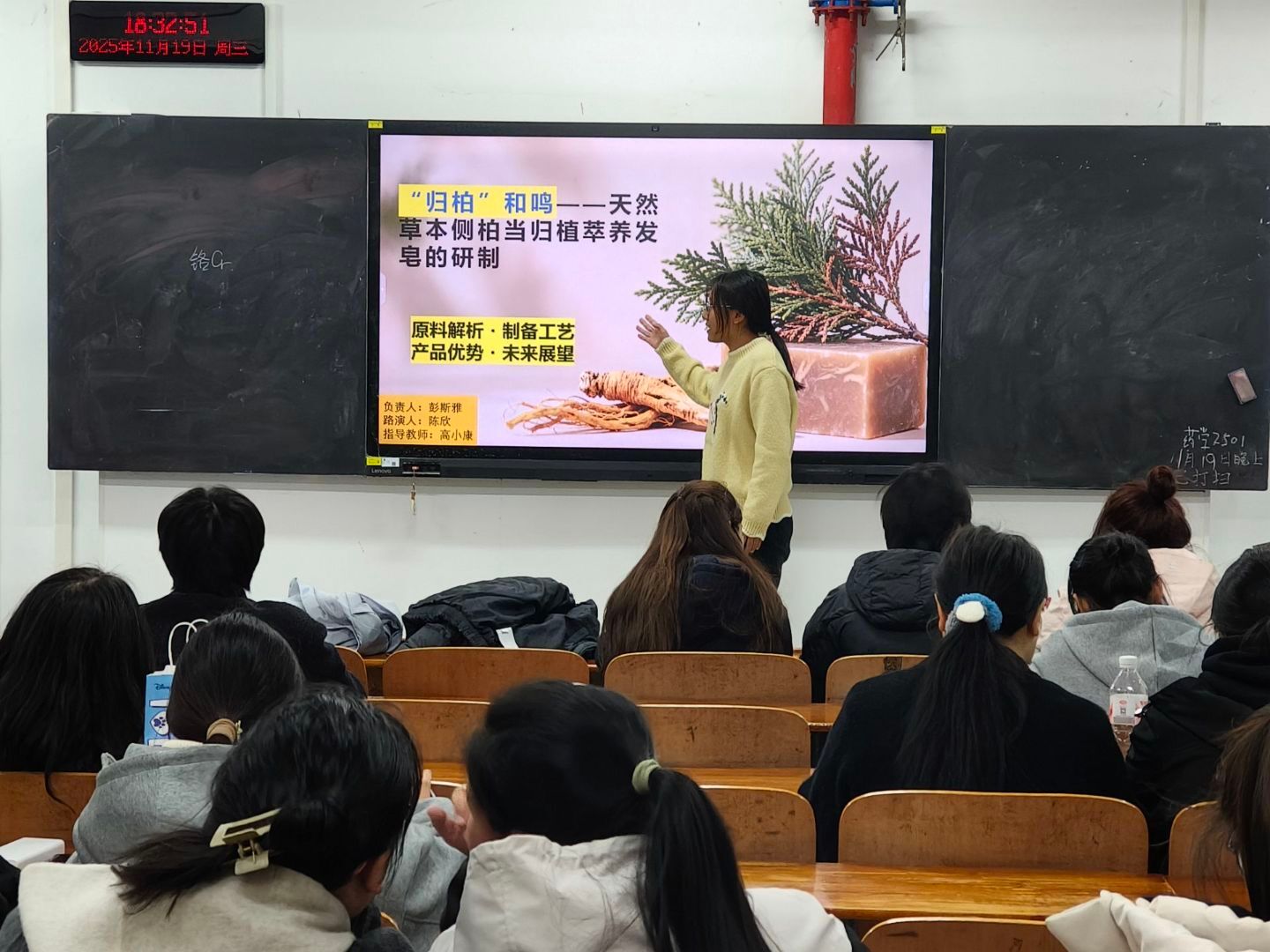 路演现场,各团队依次展示项目成果:“鲁山非遗草本手绳”项目,融合传统编绳技艺与草本疗愈功能,为乡村非遗传承与增收提供新路径;“浮选煤泥衍生分子筛负载Ru用于富蕴基化”项目,通过“原位熔融法”将活性金属钌固定在黑色二氧化钛载体上,实现煤泥废弃物的绿色转化与高效催化应用; “‘归柏’和鸣——天然草本侧柏当归植萃养发皂”项目,依托侧柏、当归等中药材的养发功效,优化制备工艺,打造兼具实用性与文化内涵的天然洗护产品……选手们用数据和实验成果支撑项目价值,在答辩环节从容回应评委关于技术壁垒、市场竞争、团队分工等问题,展现出扎实的专业素养和敏锐的创新意识。