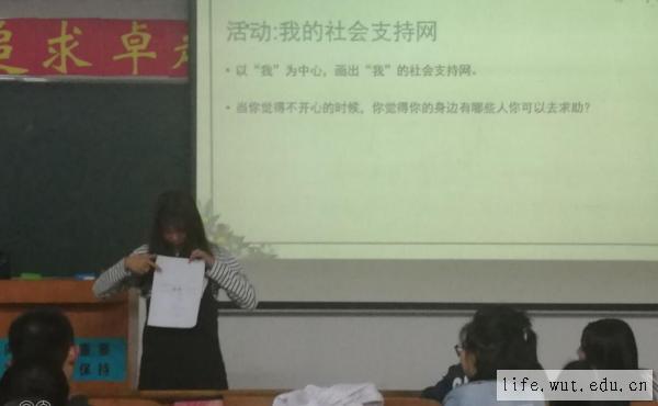 韩老师也准备了一个名叫“我的支持网”的绘画分享活动,主要是让同学们了解当自己遇到心理状况是能够寻求帮助的对象,在场的参与度很高,大家都踊跃上台分享。整个过程有序进行,韩老师通过她多互动的形式,把同学的积极性充分的调动了起来。