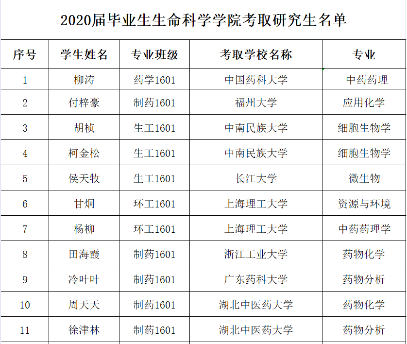 2020届毕业生太阳成城集团tyc234cc考取研究生名单