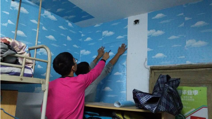 据了解,在装扮寝室的过程中存在着物资采购等问题。制药1501班的同学们特地创立了“寝室爱帮群”,在QQ群内解决大家的各类问题,针对买不到合适的墙纸,寝室装扮怎样更合适等问题,制药1501的同学们均给出了合理的答复。针对有些女生寝室墙纸不方便贴的问题,群里还有专人走进寝室为需要帮助的同学提供帮助。制药1501班的张文琪同学在帮助西四611寝室完成天花板的装饰后说:“女生在装扮寝室的时候难免会遇到一些麻烦,像我刚刚完成的天花板的装饰工作,几个女孩子自己踩着凳子去装饰既不方便也不安全,她们在爱帮群里求助,我就过来帮帮忙啦,希望能通过这个群我们班可以帮到更多需要帮助的寝室。”