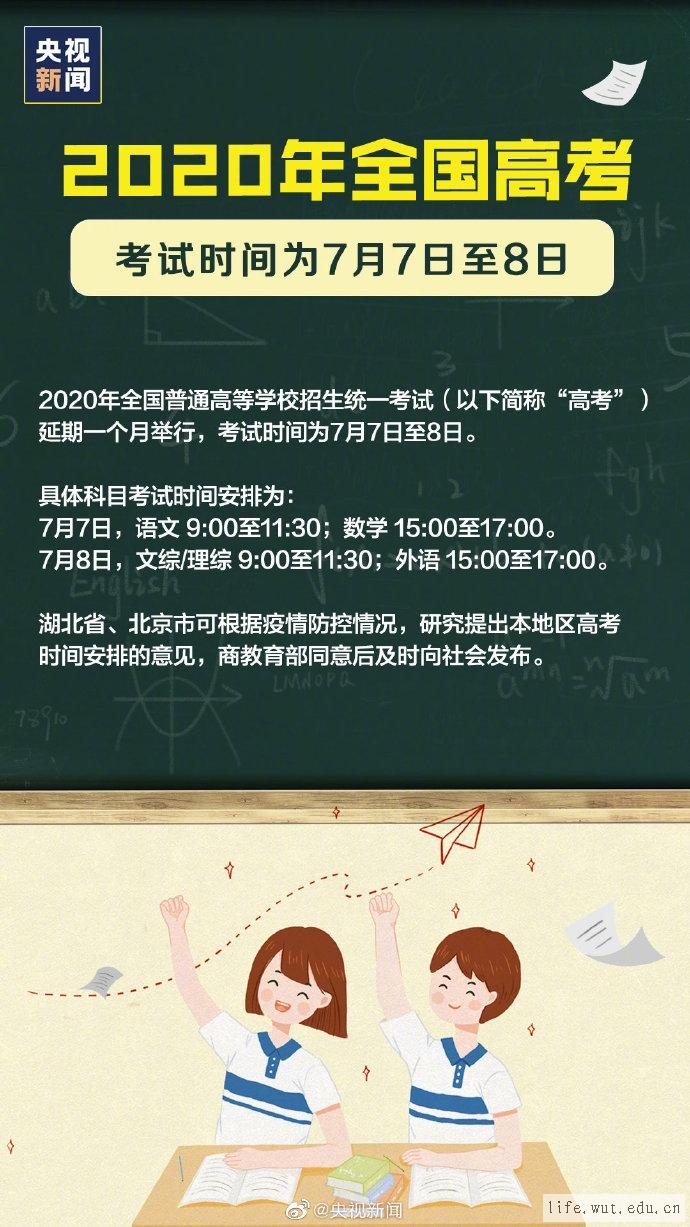 经党中央、国务院同意,2020年全国普通高等学校招生统一考试(以下简称“高考”)延期一个月举行,考试时间为7月7日至8日。