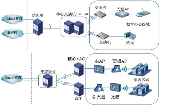 本次建设需从多角度出发,需充分考虑学校、学生、教职工、运营商的诉求,能够有效满足联合运营模式下的多方需求,本次通过认证计费系统和BRAS(Broadband Remote Access Server宽带接入服务器)、OLT(optical line terminal(光线路终端设备)、核心交换机、光AP/ONU(Optical Network Unit 光网络单元)、出口设备、利旧设备和线路(详见技术文件)进行对接,实现学生在校内使用统一的学号作为用户名,灵活选择运营商进行开户上网。将打造一个安全高效的融合网络平台,将全校学生区、办公区统一融合,有线网、无线网统一融合,实现校园网“一张网”运营。