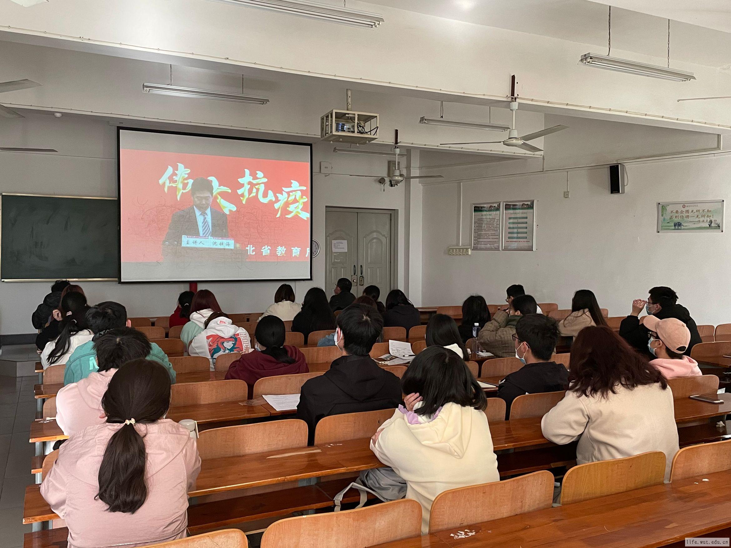 “弘扬伟大抗疫精神,厚植爱国主义情怀”。3月24日,在生科502教室,学院组织师生近100人,集体收看湖北省高校省级本科素质教育选修课《伟大抗疫精神》,并将其列入公共选修课程。