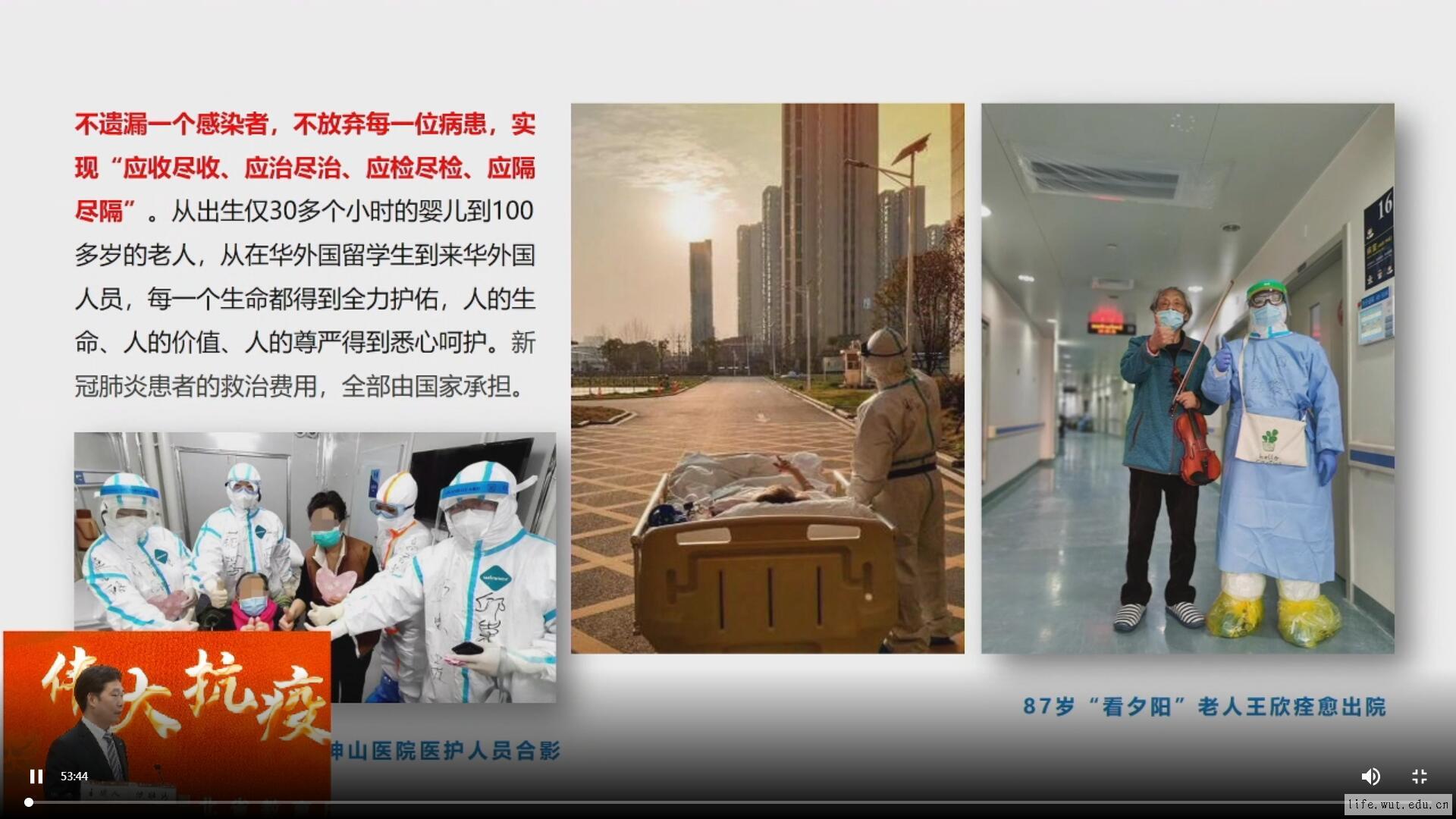 《伟大抗疫精神》课程,主要讲述面对突如其来且异常汹涌的新冠疫情,在以习近平同志为核心的党中央坚强领导下,中国人民和中华民族上下同心,团结协作、顽强拼搏,以敢于斗争、敢于胜利的大无畏气慨同新冠疫情展开了殊死较量,铸就了生命至上、举国同心、舍生忘死、尊重科学、命运与共的伟大抗疫精神。