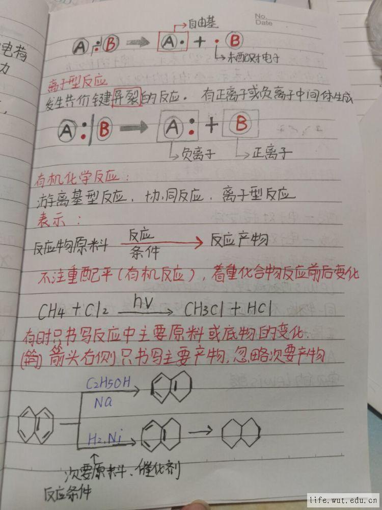 “知识点+错题(例题)”是陈姝静同学做笔记的方式。“笔记如果放上与知识点相关的题或者方程式的话,等到复习的时候回顾会更容易理解。”《有机化学》这类需要图文、方程式结合理解的课程,陈姝静认为理解知识比死记知识更为重要,她的笔记中每个反应方程旁都有必要的文字说明帮助她复习时理解运用,她也用红笔写明学习误区和注意事项。
